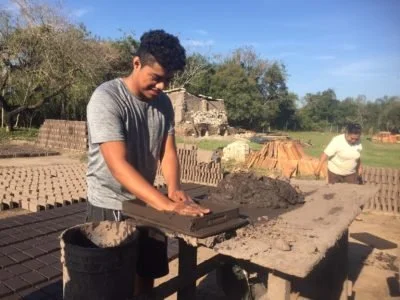 People in Tobati, Paraguay get up really early in the morning, somewhere between 3am and 5am, to go to work. The livelihood for many people in the town is brick making, and most have their own work space in the backyards of their homes. They make approximately 2,000 bricks per day. In Tobati, the clay is made from a black dirt that they buy. They put the clay in a spinning wheel barrel which smashes it. The modern wheel barrels are electronic, but we saw some older systems powered by horses and even people! Next, they grab the clay and mold it into the brick shape. The bricks pop out of the molds and, finally, the clay dries completely before it is baked in ovens.