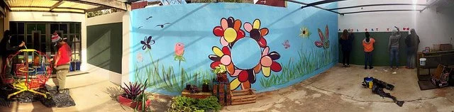 One group wanted to create a classroom space for adults in the multipurpose room; their idea started with painting the walls happy colors, like yellow, blue and green, and then adding a sun with the words “CONIN” on one wall of the room. It is difficult, especially when it rains, to walk and drive around the barrio of Santa Ana where CONIN is located, so another group suggested a plan of obtaining two vans that would drive around the neighborhood to pick up the mothers and their children. The director was pleased with all of our proposals and after some deliberation with the rest of her staff, she chose painting the multipurpose room and updating the outdoor space with the flower mural with two “chalkboards”, one for the children and another for the CONIN employees to post announcements, news and other important information for the mothers who visit the center.